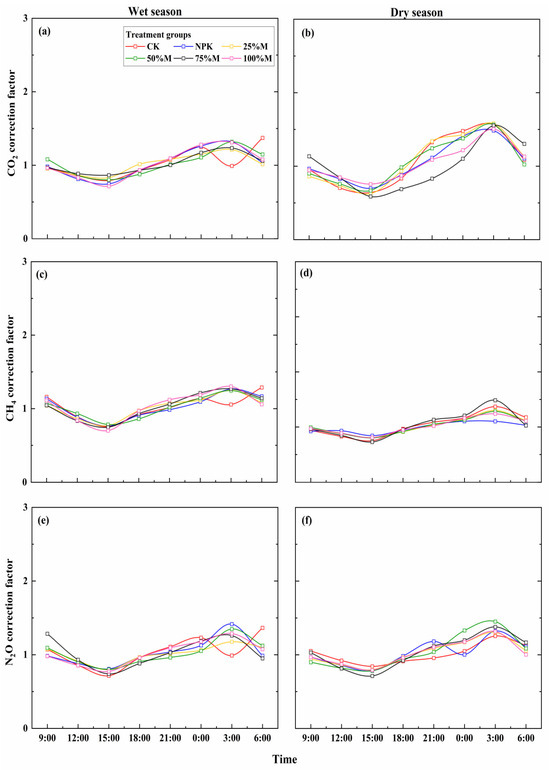 Distribution of correction coefficients for soil GHG fluxes over times of the day between wet season and dry season. CO2 (a,b), CH4 (c,d), and N2O (e,f).