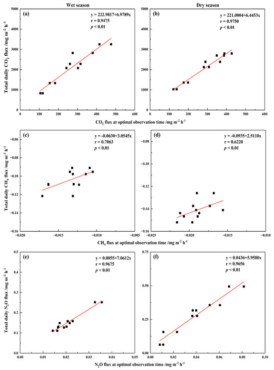 Regression analysis of fluxes versus total daily fluxes for each GHG at the optimal observation time between wet season and dry season. CO2 (a,b), CH4 (c,d), and N2O (e,f).