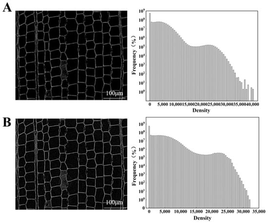 Layer-by-layer porosity maps of the tangential section in Pinus koraiensis (A) and Pinus massonian (B).