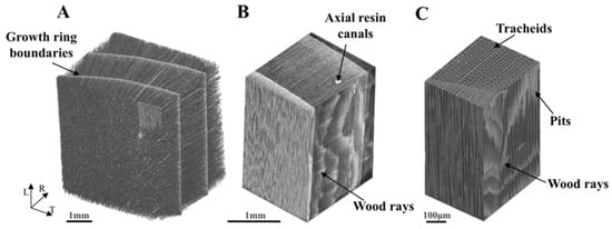 As a vital plant resource, softwood possesses distinctive anatomical characteristics [1], which support its extensive application in industries such as construction, pulp production, and furniture manufacturing [2]. These anatomical features primarily include axial tracheids, wood rays, axial parenchyma, and resin canals [3,4,5], which significantly influence wood growth, development, and environmental adaptability [6,7]. They also play crucial roles in the physical and mechanical properties of wood, which certainly determines the overall utilization value of timber [7,8]. For instance, the morphology and spatial distribution of axial tracheids influence the water transport capacity of wood [9], while the arrangement of wood rays is related to its compressive strength [10]. The detailed analysis of the morphological and spatial distribution of these internal anatomical characteristics provides accurate and comprehensive 3D data, which can aid in the development of advanced biomimetic wood materials. Moreover, such research enables a better understanding of the relationships between different hierarchical structures within wood, allowing for the optimization of wood processing techniques and usage to improve properties such as strength, stiffness, and resistance to deformation.