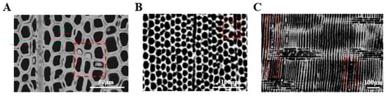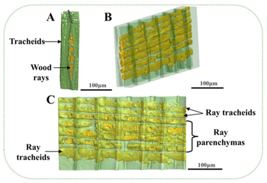 The shape of uniseriate rays in Pinus massoniana is irregular or rectangular (Figure 11B,C). The rays with an irregular shape have distinct end wall edges, with portions extending outward. Despite the resolution being as high as 0.5 μm, the images based on virtual slices still exhibit some blurry boundaries. Generally speaking, the uniseriate rays in Pinus massoniana uniformly arrange in the radial direction, forming a tight network structure. This structure contributes to water and nutrient transportation along the radial direction, and to the mechanical stability and bending resistance of the wood [47].