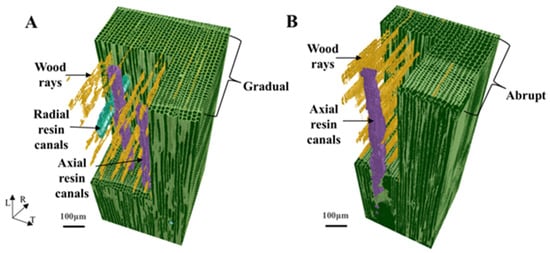 Three-dimensional structure of the transition from earlywood to latewood. (A): the gradual transition from earlywood to latewood in Pinus koraiensis. (B): the abrupt transition in Pinus massoniana. The axial tracheid lumens, axial tracheid walls, axial resin canals, radial resin canals, and wood rays are highlighted in dark green, light green, purple, blue, and yellow, respectively.