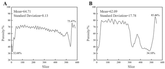 Figure 6 presents layer-by-layer porosity curves along the tangential sections of Pinus koraiensis and Pinus massoniana, derived from X-ray CT images at a resolution of 1.8 μm. These curves quantitatively reflect the structural differences in the transition from earlywood to latewood within a single growth ring.