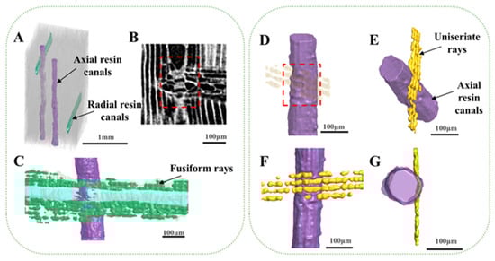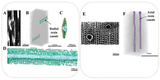 The structure of resin canals in Pinus koraiensis obtained with X-ray CT. (A–D) are 2D images of radial resin canals, spatial distribution images, tangential section views, and radial section views, respectively. (E,F) show CT two-dimensional images and spatial distribution images of axial resin canals. Axial resin canals, radial resin canals, and fusiform rays are highlighted in purple, blue, and green, respectively.