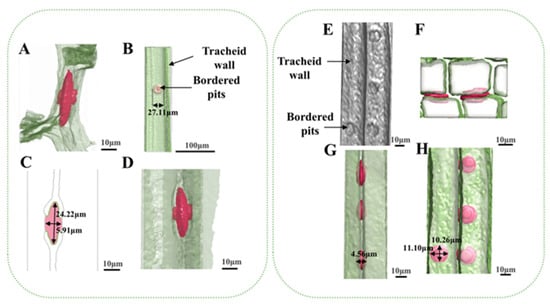Three-dimensional structure of bordered pit pairs on the walls of axial tracheids. (A–D): bordered pit pairs in Pinus massoniana. (E–H): bordered pit pairs in Picea asperata. The walls of the axial tracheids and the bordered pit pairs are highlighted in green and pink, respectively.