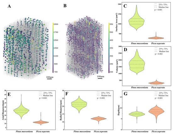 Three-dimensional anatomical analysis provides the spatial distribution, surface area, volume, and other quantitative data of bordered pit pairs (Figure 10). The surface area values and the spatial distribution of bordered pit pairs on the walls of axial tracheids are analyzed by excluding the incomplete and spatially interconnected pit pairs. In total, 677 and 688 isolated and complete bordered pit pairs are selected from Pinus massoniana and Picea asperata specimens, respectively (Figure 10A,B). The surface area and volume of bordered pit pairs on the axial tracheid walls of Pinus massoniana are 1151.60 ± 211.66 μm2 and 1715.35 ± 351.37 μm3, respectively. For Picea asperata, they are 290.43 ± 36.31 μm2 and 311.87 ± 58.16 μm3 (Figure 10C,D). The surface area and volume of bordered pit pairs on axial tracheid walls in Pinus massoniana are larger than in Picea asperata. The surface area and volume variation in Pinus massoniana is also larger than in Picea asperata. The axial diameter, radial diameter, and depth of the bordered pit pairs on the axial tracheid walls of Pinus massoniana are 25.60 ± 3.28 μm, 21.31 ± 1.78 μm, and 7.22 ± 0.62 μm, respectively. For Picea asperata, they are 11.79 ± 1.92 μm, 12.04 ± 0.64 μm, and 8.47 ± 1.17 μm (Figure 10E,F). The size of bordered pit diameters in Pinus massoniana is significantly larger than that in Picea asperata. The larger size of bordered pit diameters in Pinus massoniana is in concordance with the fact that Pinus massoniana is suited to survival in a moist environment thanks to its wide water pathways. Picea asperata exhibits great depth in the tangential direction of bordered pit pairs (Figure 10G), which helps enhance the mechanical strength and durability of the cell wall, thereby improving the wood’s resistance to environmental stress [45].