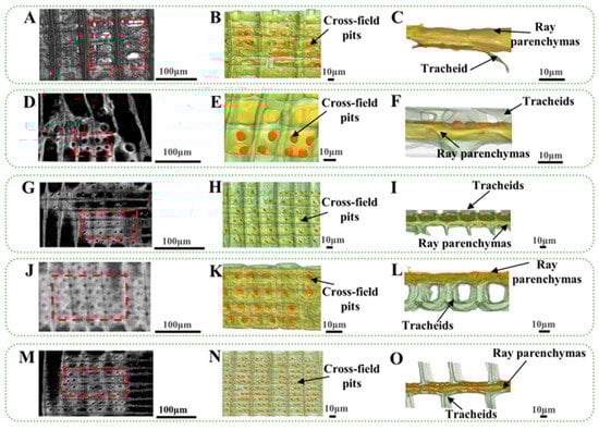 Three-dimensional structure of five types of cross-field pits. (A–C): window-like cross-field pits in Pinus massoniana. (D–F): pinoid cross-field pits in Pinus koraiensis. (G–I): taxodioid cross-field pits in Cedrus deodara. (J–L): cupressoid cross-field pits in Cupressus funebris. (M–O): piceoid cross-field pits in Pseudotsuga menziesii. Axial tracheids, ray parenchyma cells, and cross-field pits are highlighted in green, yellow, and orange, respectively.