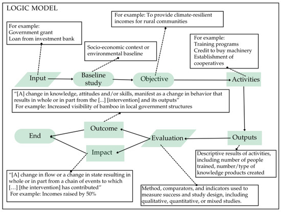 Logic model showing examples of interventions, outcomes, and other terms used to describe bamboo industry development interventions in this review, with explanations and examples of each term used.