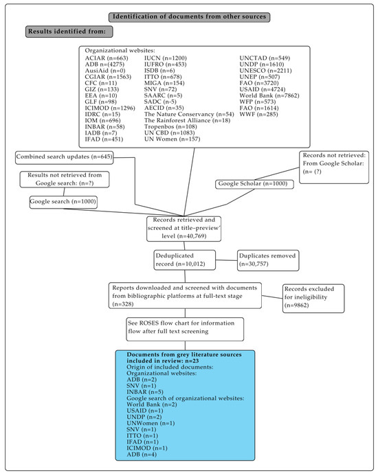 A total of 40,769 records were sought for retrieval from other sources. Figure 3 expands on the search for these documents, giving specific information on documents found from organizational websites, Google Scholar, and Google searches, which yielded a total of 23 documents included in the final review (Figure 2). Some organizational websites did not include the type of search function necessary to search for this type of document, so they were only able to be located by using Google to search the website using the search strings included.