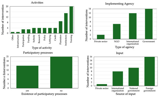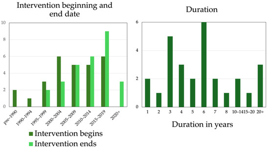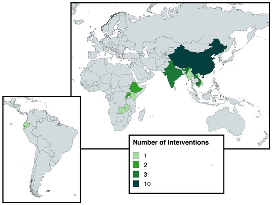 Data were collected in a spreadsheet as a database (Supplementary File S3). Data were collated using Google Sheets and analyzed using Microsoft Excel. Relevant descriptive trends are summarized below in maps, graphs, schematics, and tables. This descriptive analysis was carried out using the subcategories of the codes collected in the spreadsheet and stored in an indexable table with each row representing a single intervention (Supplementary File S3, Sheet: Interventions_indexable). This table was used to create the graphs and tables found in the Results section of this report.