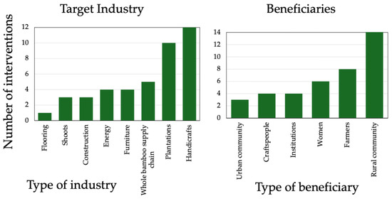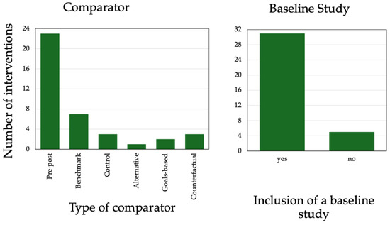 Interventions that concluded between 1990 and 2025 were included. This date range encompasses a period of rapid growth and interest in bamboo as a tool for livelihood in the international sphere. Interventions implemented by partner agencies from various groups, including governments, international agencies, non-governmental organizations, community groups, and other similar organizations, were included. Individual efforts by companies to sell bamboo projects were considered ineligible, as these projects described the growth of individual companies and not wider efforts to promote the bamboo industry. Only interventions for which a comparator could be identified were included in the review, but any comparator was eligible. In this context, inclusion of a defined “comparator” means that reported changes as a result of the intervention were compared to a clear baseline, control group, or other statistic. Categories and definitions of comparators identified during the review process are defined in Supplementary File S3.