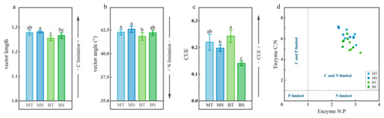 - Moorhead, D.L.; Sinsabaugh, R.L.; Hill, B.H.; Weintraub, M.N. Vector Analysis of Ecoenzyme Activities Reveal Constraints on Coupled C, N and P Dynamics. Soil Biol. Biochem. 2015, 93, 1–7. [Google Scholar] [CrossRef]