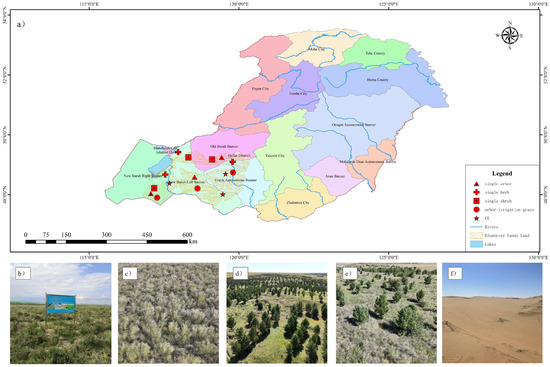 Summary map of the study area. Note: The base map is produced using the standard map of the Inner Mongolia Autonomous Region Department of Natural Resources, with the review number of Meng S(2023)027 and no modification of the base map boundary. (a) is the map of the Hulunbeier administrative division; (b) is the map of the goat grass sample site; (c) is the map of the poplar firewood sample site; (d) is the map of the camphor pine forest sample site; (e) is the map of the camphor pine + poplar firewood + goat grass sample site; and f is the map of the actual photo of the flowing sandy land. (f) stands for Moving Sand (CK).