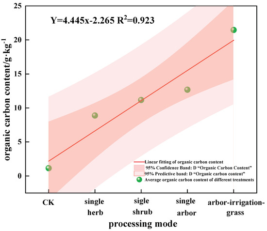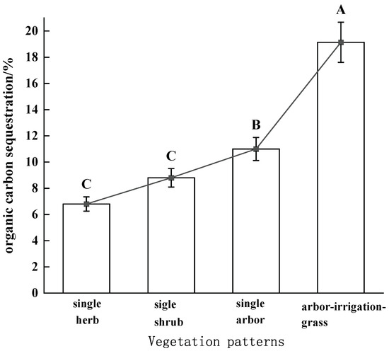 (1) The soil organic carbon contents of the four vegetation patterns were higher than that of CK, and the differences between the patterns were obvious, mainly as follows: arbor–irrigation–grass (22.96 g.kg−1) > single arbor (12.68 g.kg−1) > single shrub (11.17 g.kg−1) > single herb (8.89 g.kg−1) > CK (1.14 g.kg−1). The combined arbor–irrigation–grass pattern had the most significant effect on soil organic carbon production and accumulation, which increased by 1914.04% compared with CK. Organic carbon sequestration was consistent with the change in organic carbon content, and the soil organic carbon sequestration was the largest in the combined pattern of arbor–irrigation–grass. This indicates that the combination of arbor–irrigation–grass mode is more favorable to the accumulation of organic carbon, which is conducive to the improvement of soil quality and carbon sequestration capacity;