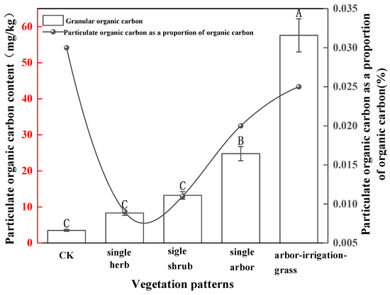 Effects of different vegetation patterns on soil particulate organic carbon content. Note: different capital letters indicate significant differences between different vegetation types (p ≤ 0.05).