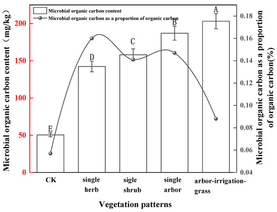 Effects of different vegetation patterns on soil microbial organic carbon content. Note: different capital letters indicate significant differences between different land types (p ≤ 0.05).