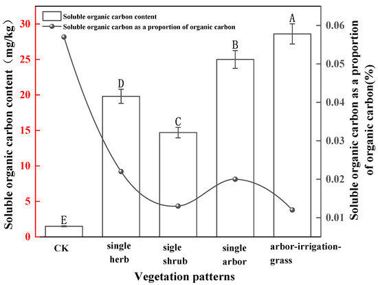 Effects of different vegetation patterns on soil-soluble organic carbon content. Note: different capital letters indicate significant differences between different land types (p ≤ 0.05).