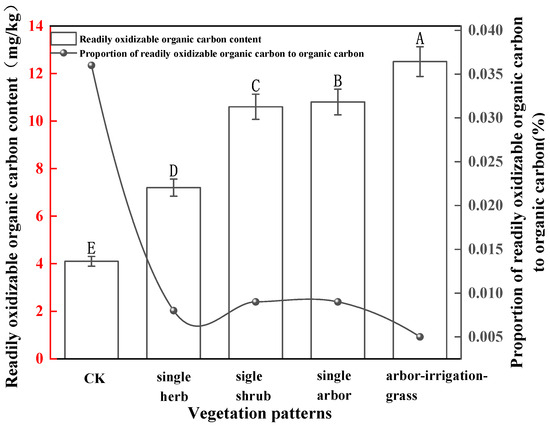 Effects of different vegetation patterns on soil easily oxidized organic carbon content. Note: different capital letters indicate significant differences between different land types (p ≤ 0.05).
