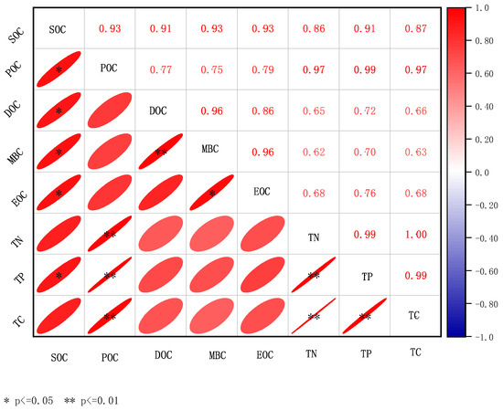 The correlation of each component is shown in Figure 8.The pattern of change between SOC and its components (POC, DOC, MBC, and EOC) was the same, showing a significant positive correlation, with correlation coefficients of 0.93, 0.91, 0.93, 0.93, and 0.93 (p ≤ 0.05), respectively; there was a significant positive correlation between SOC and TP, with correlation coefficients of 0.91 (p ≤ 0.05), which indicated that TP had a greater influence on SOC. POC was positively correlated with TN, TP, and TC, and the correlation coefficients were 0.97, 0.99, and 0.97, respectively (p ≤ 0.01), indicating that TC, TN, and TP were all influencing factors of POC. DOC showed a highly significant positive correlation with MBC, with a correlation coefficient of 0.96 (p ≤ 0.01). MBC showed a significant positive correlation with EOC, with a correlation coefficient of 0.96 (there was a highly significant positive correlation between TN and TC and TP, with correlation coefficients of 1.00 and 0.99 (p ≤ 0.01), respectively, and a highly significant positive correlation between TC and TP, with correlation coefficients of 0.99 (p ≤ 0.01), respectively).