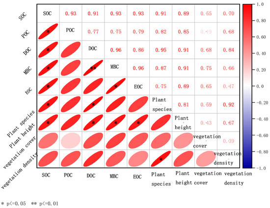 The correlation of each component is shown in Figure 9.The number of plant species was significantly correlated with organic carbon and soluble organic carbon (p ≤ 0.05), with correlation coefficients of 0.91 and 0.95, respectively; the correlation between the height of plants and organic carbon, soluble organic carbon, microbial organic carbon, and easily oxidized organic carbon was more significant (p ≤ 0.05), with correlation coefficients of 0.89, 0.91, 0.91, and 0.89, respectively; the correlation between the vegetation cover and the vegetation density and the organic carbon and its components was not significant. Organic carbon and its components were not closely related.