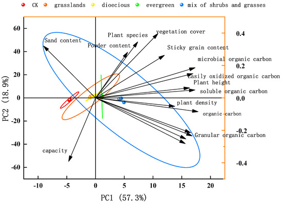 The relationships among the principal components are shown as follows Figure 10. The contribution rate of PC1’s was 57.3% and that of PC2’s principal component was 18.9%, and the cumulative contribution rate of the two principal components reached 76.2%, which indicated that this study was representative. The contents of organic carbon and its components were all at an acute angle with the vegetation growth indicators, and the positive correlation between them was high. The organic carbon components and their contents have a great influence on the vegetation growth indexes in the region, and controlling their contents is beneficial to the recovery and reconstruction of the local vegetation.