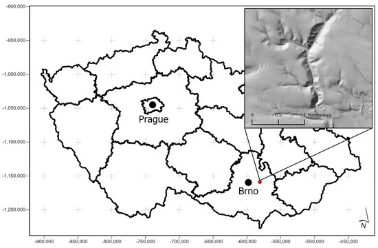 We collected data in the Vítovický žleb locality (Figure 1), situated approximately 20 km east of the city of Brno (Figure 1). This area encompasses the valley of the Vítovický stream, characterised by mixed forest cover predominantly composed of Scots pine 70% (Pinus sylvestris L.), English oak 20% (Quercus robur L.), and, sporadically, Norway spruce 10% (Picea abies (L.) H. Karst.). The locality features a deeply incised valley with numerous conglomerate outcrops and boulders, while the terrain above the valley primarily exhibits plateau characteristics.