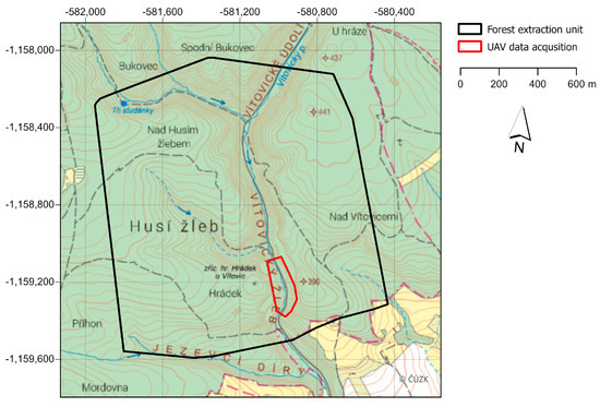 A designated forest extraction unit (Figure 2) was established in the area, covering 186 ha, featuring a unified direction for timber extraction, and containing terrain obstacles to verify their identification. The area includes a main forest road providing access along the watercourse in the deeply incised valley. ALS data with varying point densities were used to design skidding trails for extraction technologies in the interior parts of forest stands. Specifically, data from the DMR 5G from 2013, consisting of pre-classified ground points with an average density of 1 point/m2, and data from a separate aerial laser scan (ALS) of the area in spring 2022 (outside the vegetation period) with an average density of 12 points/m2 before ground point classification. Both datasets in LAS format were processed using ArcGIS Pro 3.4 software. These data were also used to verify the identification of terrain obstacles for timber skidding and to specify the direction and length of timber extraction from logging sites to forest road landing.