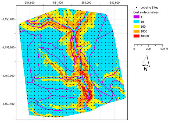 We created a regular 50 × 50 m grid of potential logging sites (745 sites) to simulate the location of thinning or regeneration harvesting in the forest stand (Figure 3). Although it is not possible to use skidding with wheeled or tracked forwarders on the slopes of the deep valley, an analysis of the slope length in the steepest places revealed that the length did not exceed 150 m, and therefore skidding was possible with the help of a winch on a specialised forest tractor. The same timber extraction technology was then used on the plateau of the transport segment locality. Subsequently, a cost surface solution was calculated, considering both the accessibility of the locations and the selection of extraction technologies. A classified slope layer was divided into four categories: terrain obstacles higher than 0.5 m with a 5 m buffer zone, forest roads, skidding tracks from ZABAGED, and designated timber stacks. The cost surface was developed based on the definition of passability from 1 to 10,000 and barriers for the most frequently used technologies in the locality, skidding with a tractor winch or forwarder extraction. The classification for creating the cost surface is shown in Table 2.