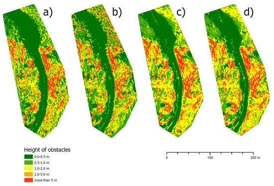 The quality of DTMs affects the model’s ability to detect terrain obstacles accurately. Differences in quality and the ability to capture terrain details based on the categorised heights of obstacles are illustrated in Figure 4. The detail of the terrain thus also influences the calculation of skidding routes, as the quality of the DTM can exceptionally affect the final extent of small obstacles up to 0.5 m (Figure 4 and Figure 5, Table 4).