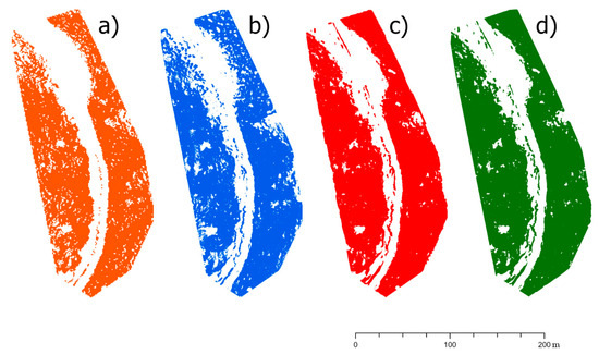 - Moudrý, V.; Gdulová, K.; Fogl, M.; Klápště, P.; Urban, R.; Komarek, J.; Moudrá, L.; Štroner, M.; Barták, V.; Solský, M. Comparison of leaf-off and leaf-on combined UAV imagery and airborne LiDAR for assessment of a post-mining site terrain and vegetation structure: Prospects for monitoring hazards and restoration success. Appl. Geogr. 2019, 104, 32–41. [Google Scholar] [CrossRef]