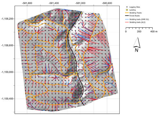 ALS data can then be used to determine the actual skidding distance and calculate skidding costs, combined with extraction length and slope maps for designing the forest road network and selecting the type of machinery appropriate for the extraction. The accuracy of DTMs significantly affects route planning. Ref. [48] provides a quantitative approach to determining whether skidding to the roadside or to centralised landing is better and to evaluating and selecting alternative potential stacking locations. Although the model developed in this study offers excellent potential to assist in forest operations planning, model validation involving field comparisons between operator-generated and computer-generated skidding trail networks should be conducted.
