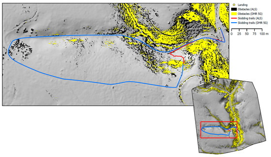 If ALS data alone were used, mapping preparation and verification of terrain obstacles in the field would still be necessary, as this step cannot be omitted in such cases. Conversely, UAVs can replace subsequent physical reconnaissance of barriers in the field, allowing forest workers to conduct terrain reconnaissance quickly.