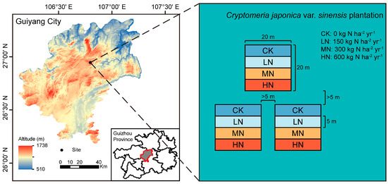 The study area is located in the Liutun branch of the Zhazuo Forest Farm, Guizhou Province, China (106°80′~106°81′ E, 26°95′~26°96′ N; 1200–1607 m a.s.l.). This area has a subtropical monsoon climate, where the mean annual temperature, annual precipitation, and relative humidity are 13.6 °C, 1200–1350 mm, and 85%, respectively. Underforest tending was implemented in 2011 in this area, as the vegetation type is relatively simple, with Cryptomeria japonica var. sinensis as the main artificial vegetation. The dominant understory species are Pyracantha fortuneana, Sabia japonica, Oplismenus compositus, etc. The area is dominated by Alisols (yellow soil) [32]. The basic soil properties in the upper surface (0–20 cm) were reported in our previous study [33]. The plots contained 3.25 g·kg−1 total phosphorus (TP) before N addition. The plots contained 111.71~194.08 μS·cm−1 electric conductivity (EC), 2.84~3.16 g·kg−1 total N (TN), 3.49~4.07 g·kg−1 TP, 5.04~5.41 g·kg−1 total potassium (TK), 1.58~2.45 mg·kg−1 available phosphorus (AP), and 82.04~89.88 mg·kg−1 available potassium (AK) after two years of N addition.