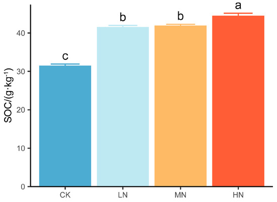 The SOC concentration significantly increased as the level of N addition increased; furthermore, the SOC concentration increased by 31.9%~41.2% under N addition compared with that in the CK group (Figure 2).
