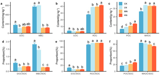 Concentrations of (a) DOC and MBC, (b) EOC and ROC, and (c) POC and MAOC and distribution ratios of (d) DOC and MBC, (e) EOC and ROC, and (f) POC and MAOC under nitrogen addition. The values are the means ± standard errors. Different letters in the same index denote significant differences under nitrogen addition (p < 0.05). n = 9.