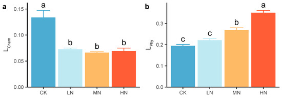 N addition had significant effects on L. LChem decreased significantly and reached a minimum in the MN group under N addition, whereas LPhy increased significantly and increased with increasing N addition level (Figure 4). Compared with that in the CK group, the LChem significantly decreased by 45.9%~50.6% (Figure 4a), whereas the LPhy significantly increased by 37.8% in the MN group and by 79.5% in the HN group (Figure 4b).