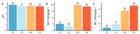Values of (a) pH and concentrations of (b) ammonium nitrogen and (c) nitrate nitrogen under nitrogen addition. The values are the means ± standard errors. Different letters in the same index denote significant differences under nitrogen addition (p < 0.05). n = 9.