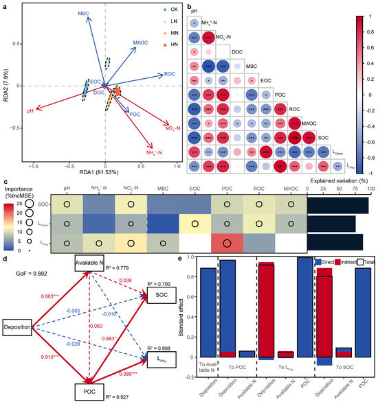 (a) Redundancy analysis (RDA) of the soil chemical properties and soil organic carbon (SOC) fractions under nitrogen addition. Red arrows indicate soil chemical properties, and blue arrows indicate SOC fractions. (b) Pearson’s correlation analysis of soil chemical properties, SOC and its fractions, and L. The significant values of each index are * p < 0.05, ** p < 0.01, and *** p < 0.001. (c) Random forest (RF) for SOC and L. The color blocks represent only the importance values of the factors with significant Pearson correlations (p < 0.05), and the circle sizes represent only the importance values of the significant factors (p < 0.05). (d,e) Partial least squares structural equation modeling (PLS-SEM) and standardized effect values of SOC and L. Red and blue arrows indicate positive and negative paths, respectively, and dotted lines indicate nonsignificant relationships (p > 0.05). The significance values for each path are * p < 0.05, ** p < 0.01, and *** p < 0.001.