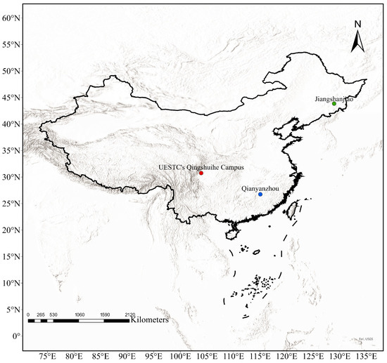 The study selects three forest ecosystems from different geographic regions within China as study areas: Jiangshanjiao Experimental Forest Farm, Forestry Academy of Heilongjiang Province (43°8 N, 128°9 E), Qianyanzhou Subtropical Forest Ecosystem Observation Station, Chinese Academy of Sciences (26°7 N, 115°0 E), and the Qingshui River campus of the University of Electronic Science and Technology of China in Chengdu, Sichuan Province (30°7 N, 103°9 E). The study area map is shown in Figure 1. The Jiangshanjiao observation station mainly includes temperate mixed forests of larch, red pine, white birch, and mountain ash, while the Qianyanzhou station mainly consists of subtropical evergreen broadleaf forests of oil tea, citrus, and fir trees. The observation site at the University of Electronic Science and Technology includes subtropical evergreen broadleaf forests with camphor, nanmu, and Osmanthus trees.