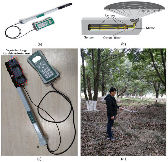 Experimental data collection. (a) LAI-2200C; (b) LAI-2200C measurement principle; (c) Experimental equipment connection diagram; (d) Experimental site map.
