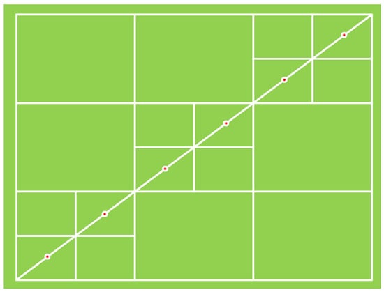 Under relatively ideal weather conditions (overcast, low wind speed, no rainfall) [21], measurements were conducted in flat areas within the experimental zone using a 6 × 3 grid sampling method. Specifically, six sample points were collected along the diagonal direction of each sampling area at equal intervals, with a minimum spacing of 10 m between sampling points. During the data collection process, it is essential to rigorously adhere to the measurement standards of the LAI-2200C to ensure the reliability of the data and the quality of the images [52]. As shown in Figure 3, the green background represents the sampling area, and the red dots indicate the sample collection points. To minimize single-measurement errors and ensure the stability and accuracy of the data, each sample point was measured three times. As shown in Figure 3, the green background represents the sampling area, and the red dots indicate the sample collection points. To minimize single-measurement errors and ensure the stability and accuracy of the data, each sample point was measured three times.