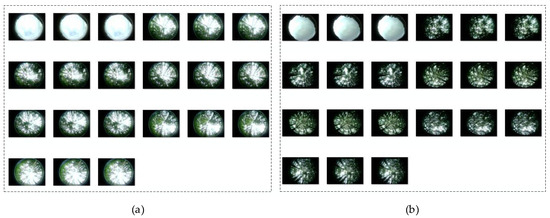 This study collected 60 sets of data, with 20 sets from each study area. Each data set includes one LAI-2200C measurement file and 21 vegetation canopy hemispherical images (3 images are of the outside vegetation, and 18 are of the vegetation canopy). The sample data is shown in Figure 4, where Figure 4a represents the images of the Chinese fir forest collected in Qianyanzhou, and Figure 4b represents the images of the mixed conifer-broadleaf forest collected in Jiangshanjiao. The LAI-2200C measurement file contains information such as firmware version, file creation time, GPS log, and LAI calculation results [47]. It is important to note that during the measurement process, the LAI-2200C computes the overall LAI of the area by averaging the results of each sample point within a specific sampling region, and generates a measurement file based on this data. In this study, the arithmetic mean of the LAI calculated from the 18 vegetation canopy images was used to represent the measurement results of the inversion method proposed in this paper. This approach ensured a comprehensive consideration of all sample data, effectively reflecting the overall variation in the LAI across the sampling area and providing an objective benchmark for evaluating the performance of the inversion method.