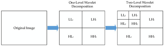 Common frequency analysis methods include the Fast Fourier Transform (FFT), Wavelet Transform, and Hilbert–Huang Transform (HHT) [53]. The FFT lacks spatial information, making it unsuitable for extracting boundary features [54]. Although the HHT handles nonlinear and non-stationary data well [55], its high computational complexity and the absence of significant nonlinear or dynamic characteristics in canopy images limit its practical applicability. In contrast, the wavelet transform is a highly useful technique in image processing. By using wavelet transform, images can be decomposed into different scales and frequency components, enabling information extraction in both spatial and frequency domains, as illustrated in Figure 5.