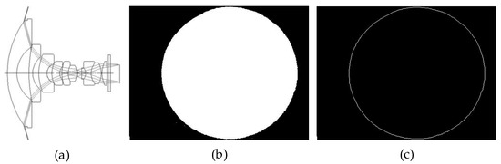 Image area extraction. (a) Schematic diagram of fisheye lens imaging; (b) Binary image; (c) Imaging area boundary.