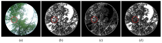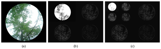 The hemispherical photography method involves capturing canopy images from below the plant canopy using a camera equipped with a fisheye lens, with a viewing angle range from 180° to 200°, where the foreground is vegetation and the background is the sky, as shown in Figure 7a. The canopy image consists of three regions: the leaf area, the trunk area, and the sky area, which exhibit significant differences in grayscale and frequency. The leaf area has a higher reflectance, finer texture, and is primarily concentrated in high-frequency bands after wavelet transformation. The trunk area is typically darker, with the lowest grayscale and weaker reflection, mainly concentrated in low-frequency bands. The sky area is well-lit, with the highest grayscale, generally appearing in the canopy gaps, and corresponds to the image’s low-frequency information.