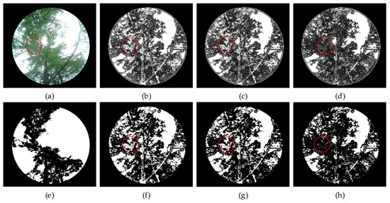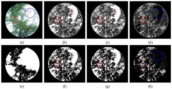 Grayscale mean-based suppression segmentation results. (a) Original image; (b–d) Reconstructed images with ; (e–h) Otsu’s segmentation of (a–d). (Red circle: leaf-as-sky errors; Blue circle: sky-as-leaf errors).
