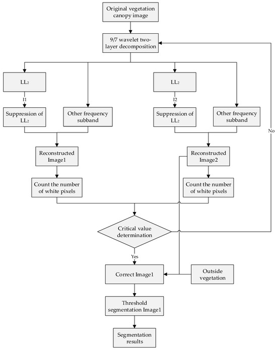 Accurate segmentation of leaf areas is critical for precise LAI measurement, as it provides the foundational data required for reliable calculations. To achieve this, wavelet decomposition is applied to the vegetation image, with an emphasis on suppressing low-frequency components. This suppression minimizes the influence of background elements (e.g., trunks and sky) on leaf area segmentation, thereby enhancing the grayscale contrast between leaf regions and other parts of the image. The improved contrast facilitates the effective use of image segmentation algorithms, enabling more accurate extraction of leaf areas and ultimately contributing to higher precision in LAI estimation.