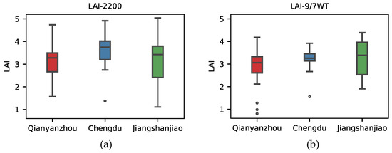The experimental results show that the LAI extracted by the inversion method designed in this paper is overall smaller than the LAI-2200C measurement results, which is similar to other studies. This discrepancy occurs because the LAI-2200C assumes that tree leaves are optical black bodies, absorbing all light and neglecting reflection and refraction effects between leaves. In reality, tree leaves have certain reflective and transmissive properties, which affect the light propagation within the canopy and consequently the gap rate measurement. This leads to a smaller gap rate and an overestimation of the LAI in the LAI-2200C measurements. Moreover, the LAI-2200C is sensitive to all shading objects in the field of view, including leaves, stems, and branches [61], which are all included in the measurements, causing an overestimation of the LAI.