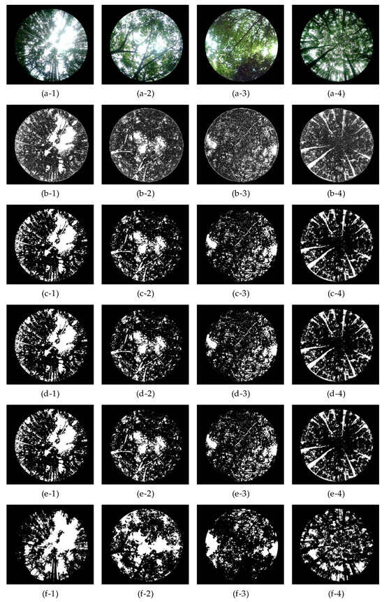 - Tian, J.; Liu, X.; Zheng, Y.; Xu, L.; Huang, Q.; Hu, X. Improving Otsu Method Parameters for Accurate and Efficient in LAI Measurement Using Fisheye Lens. Forests 2024, 15, 1121. [Google Scholar] [CrossRef]