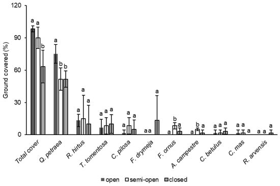 Seven woody and three herbaceous understory plant species were identified as dominant on the study sites in the following order: Quercus petraea (Matt.) Liebl. (59.4%), Rubus hirtus Waldst. and Kit. (12.8%), Tilia tomentosa Moench (8.3%), C. pilosa (5.0%), F. drymeja (4.4%), Fraxinus ornus L. (3.9%), Acer campestre L. (2.2%), Carpinus betulus L. (2.2%), Cornus mas L. (1.1%), and Rosa arvensis Huds. (0.6%) (Figure 2). The total understory plant cover showed a regularity where the highest amount of ground area covered by understory plants was in the open canopy cover class, slightly lower in the area with the semi-open canopy cover class, and significantly lower in the closed canopy cover class (Figure 2 and Table 1). The understory plant ground cover by plant species differed between different canopy cover classes, although this was only significant for some species (Figure 2 and Table 1). Of the identified species, Q. petraea covered the greatest area, and dominated in the open class, compared to both the semi-open and closed canopy classes. From the rest of the identified species, only F. ornus and A. campestre covered a significantly greater ground area in the semi-open compared to the closed and open canopy classes (Figure 2 and Table 1).